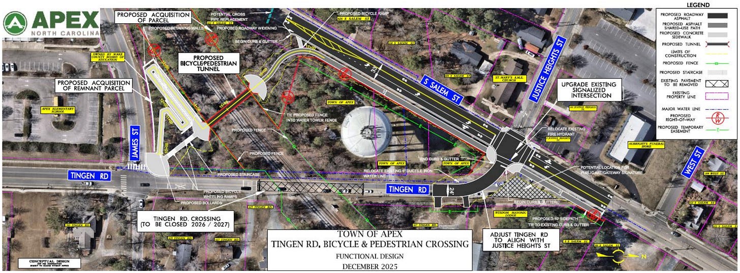 For our neighborhood, the project is an important link. The proposed tunnel would sit just across from Justice Heights Street near the water tower. It would be a direct connection between James Street and South Salem Street. That means residents would still have a short and safe route to places like Apex Elementary School, downtown Apex, and nearby neighborhoods.