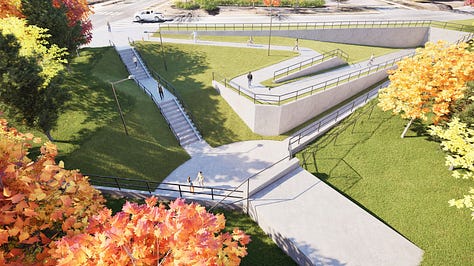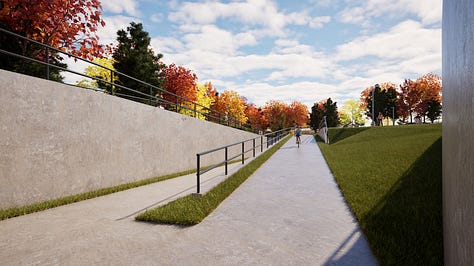 The study also includes improvements to the surrounding streets too. Plans show Tingen Road being realigned to meet South Salem Street directly across from Justice Heights Street. It creates a more traditional intersection that shortens pedestrian crossings and simplifies traffic movements. The renderings below illustrate how the tunnel entrance, pathways, and a future landscaped greenway connection could look once complete.